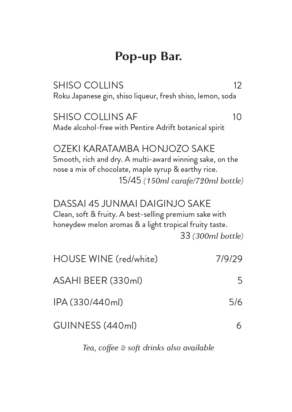 Our pop-up bar will also be open, serving shiso collins cocktails and mocktails, sake, beer, wine and more.