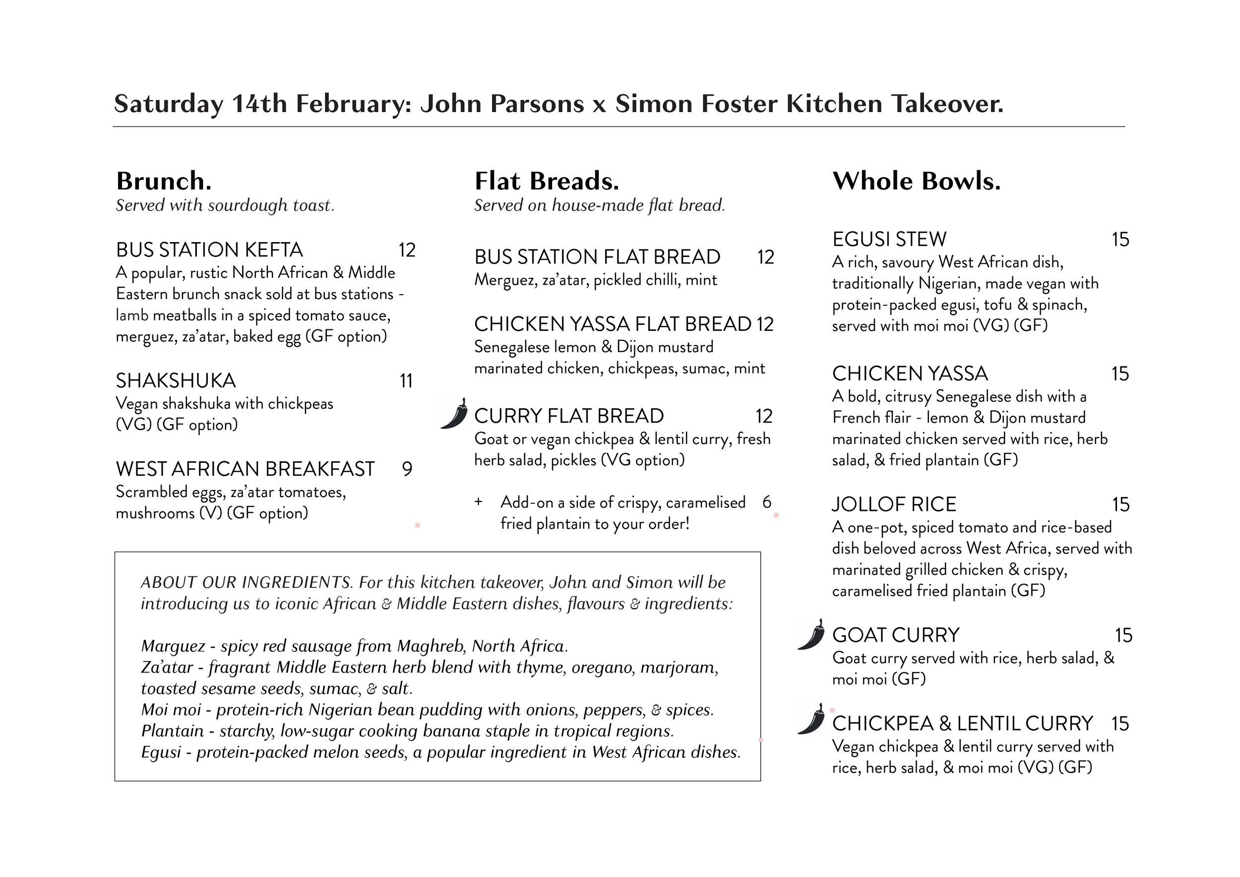 Local chefs John Parsons and Simon Foster will be taking over the Open House kitchen for the day, cooking iconic West African dishes such as Shakshuka, Bus Station Kefta (spiced lamb meatballs simmered in a tomato sauce with poached eggs), Egusi (vegan tofu and spinach stew), Yassa (lemon-marinated chicken), Jollof Rice, goat or vegan chickpea & lentil curry, flat breads, and fried plantain. See full menu below.